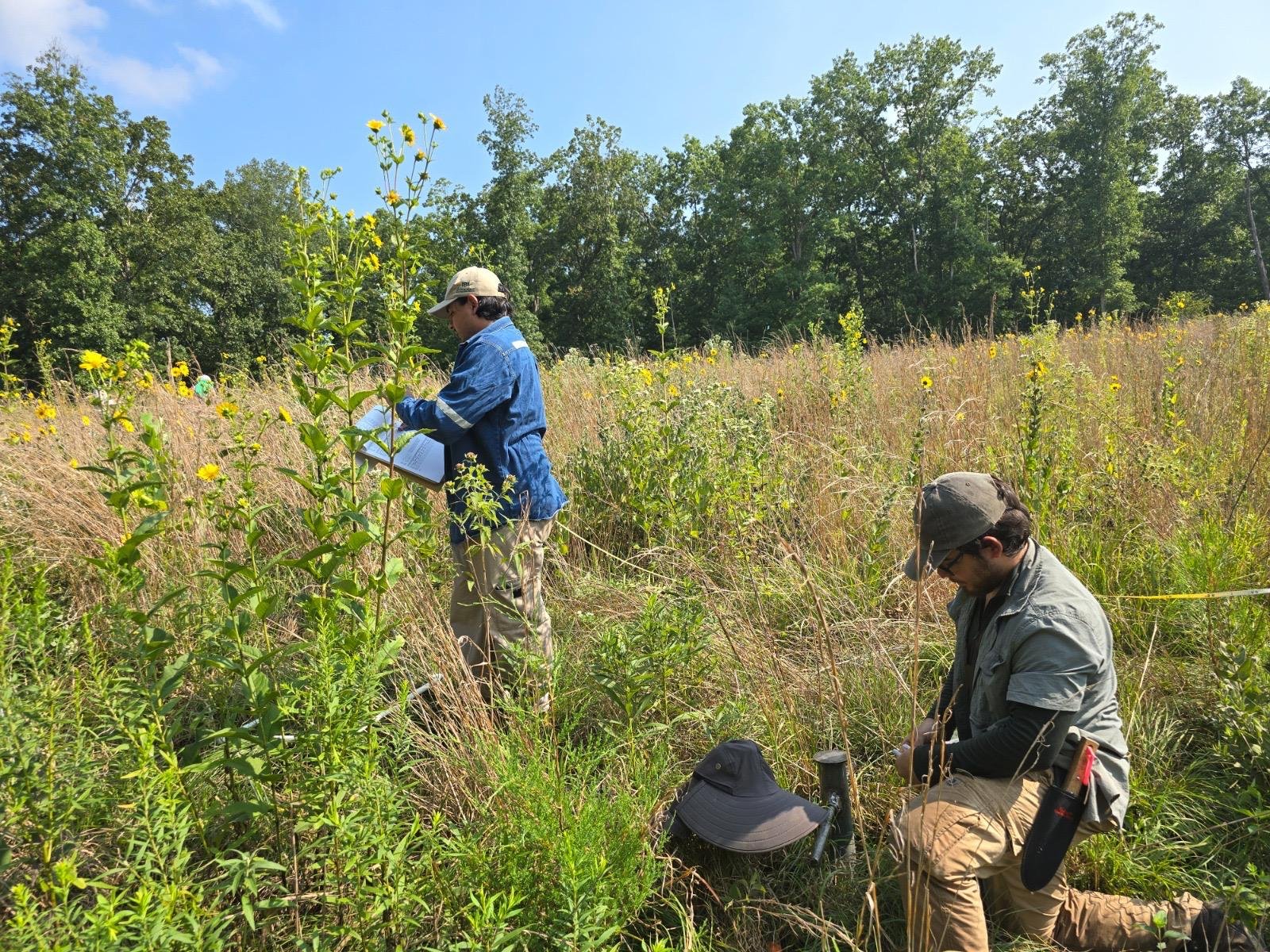 Pedro Velez and Fernando Mendoza sampling vegetation and soil at Best Hope Farm prairie (Dickson Co., TN). PC: Josue Chevez-Sahona.