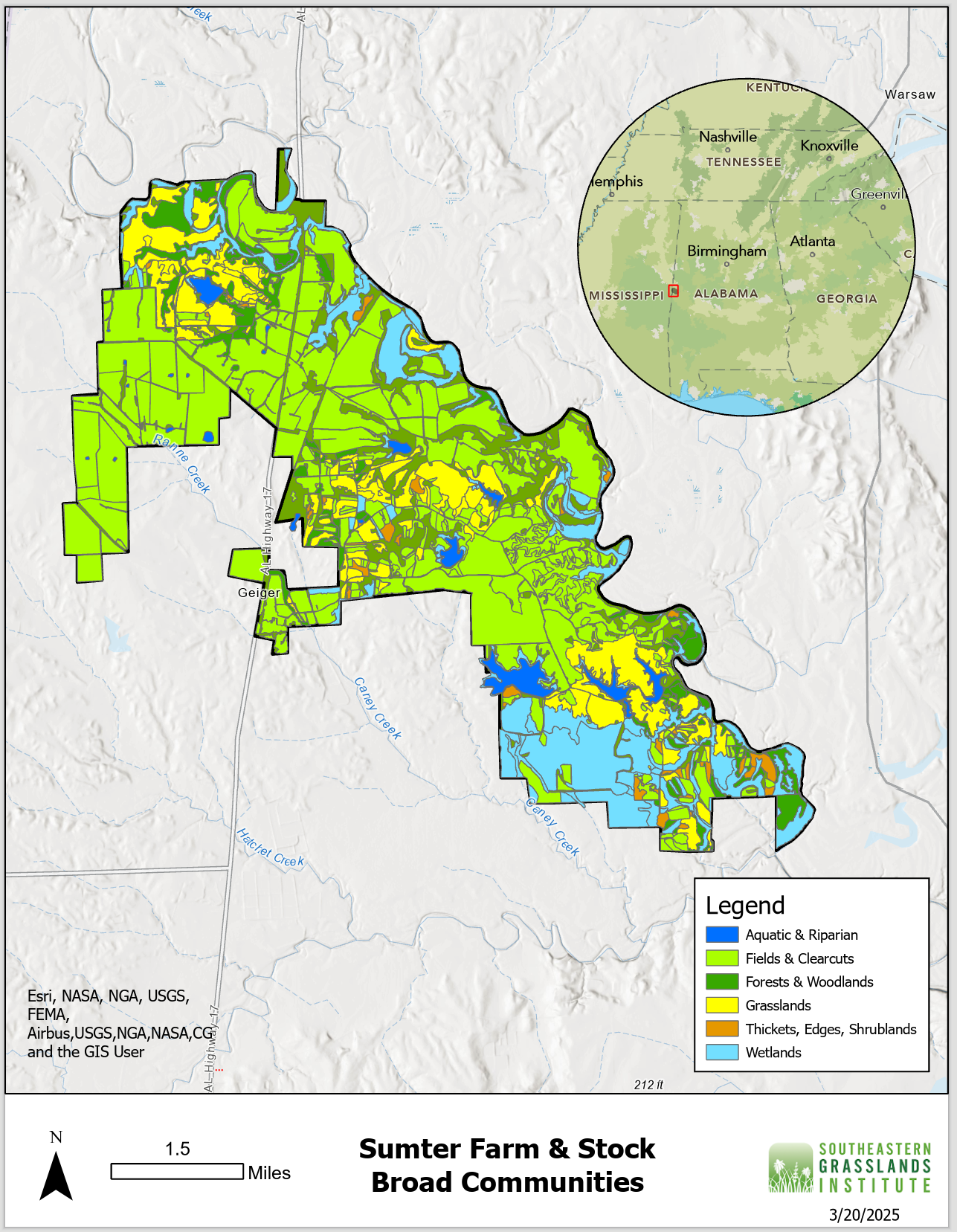 SGI is working with the Sumter Farm & Stock Company in the Black Belt Ecoregion of Alabama to map remnant grasslands, other ecosystems, and sites for future restoration work. All ecological communities are being mapped on the 11,000 acre property, which is unique in the ecoregion due to attentive land management, a nearly 100-year history of prescribed fire, and resulting abundance of remnant grasslands. A detailed inventory of the flora and fauna of the property is part of this project.